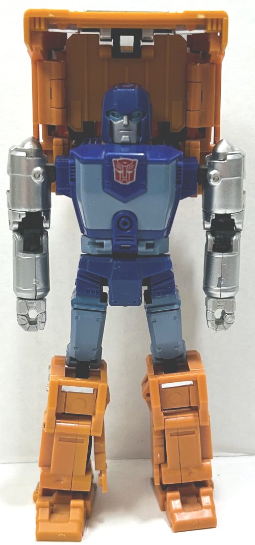 His vehicle mode is a tale of two halves. His cab looks great, though his front wheels don’t lock in place very well. The back half is kind of lousy, being way too narrow right behind his cab. He looks great in robot mode, I love the silver paint on his arms and gun, he has a great head sculpt and his paintjob is excellent. I did buy this one used, the Autobot logo on his chest was added by the previous owner. I don’t customize my toys.