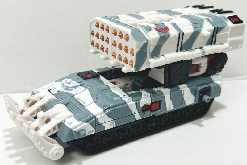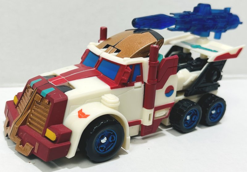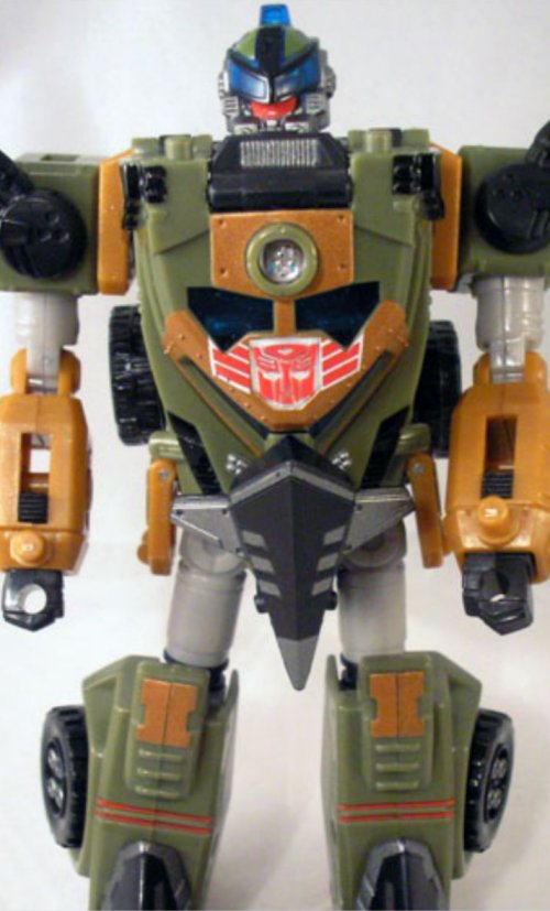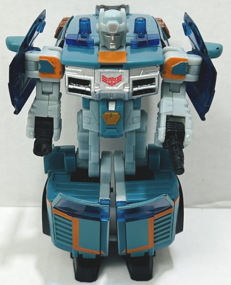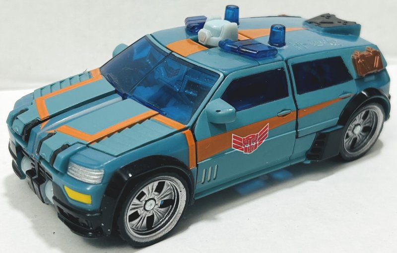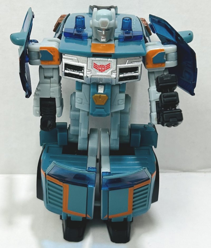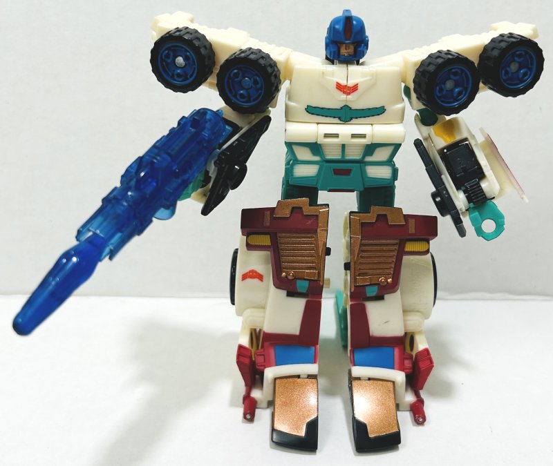 Kup is repainted from Cybertron Red Alert with a new head. He’s got a great paintjob. My only complaint is that his head sticks out the top of his vehicle mode. I mean, it would have looked stupid if it were small enough to fit, but still, it looks ridiculous. Kup’s intentional damage is far less noticeable than Flak’s.