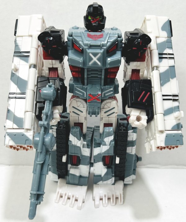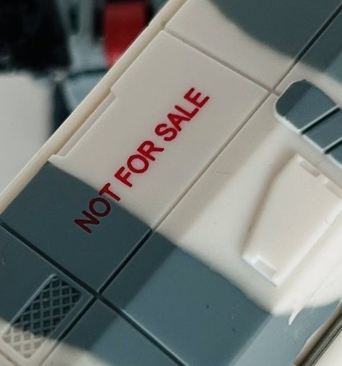 Flak, a repaint of Cybertron Defense Scattershot is an awesome toy. I love the arctic camo paintjob. This was one of my favorite Transformers Cybertron toys. Given how long it’s been since we had toys with firing missiles, it almost feels like a G1 toy, and that’s not the only reason. I don’t think he has any ball joints. He’s big and bulky and stands up well. I miss the way Hasbro used to design toys. As you can see Hasbro has stamped “Not For Sale” on it. They also damaged his chest and face, which is pretty stupid, since it only makes this a more desirable toy (more detail from Zabgoth below). I wouldn’t even know it was not a production toy if not that that. I’m sure Zabgoth can expand on the differences between this and the production version.