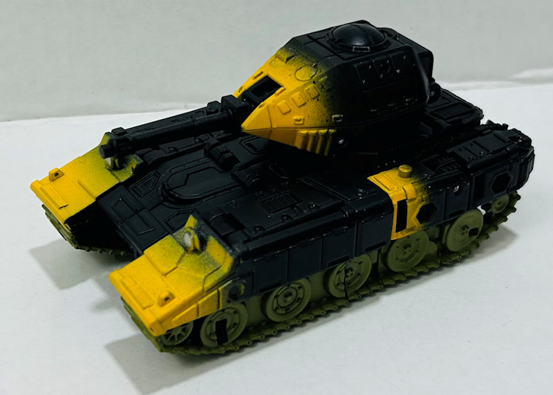 Repainted from a Generations Deluxe Class Warpath, Machine Wars Bumblebee is mostly black with yellow highlights and green treads, a nice departure from most Bumblebee toys that are predominantly yellow. I love the Bumblebee logo on his waist.