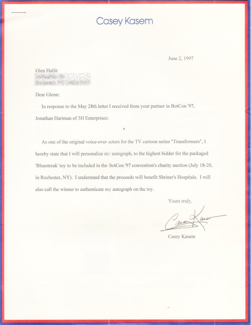 Transformers Artifacts of the Week: Botcon 1997 Charity Auction Robert Stack Authentication Letter and Casy Kasem Promissory Letter