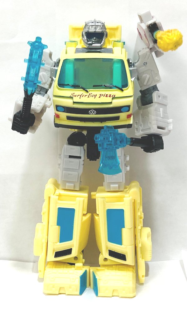 Vehicle Mode: Code Red transforms into the Surfer Boy Pizza “Pizzamobile” from Stranger Things. This is a great design, and the paint apps are perfect.