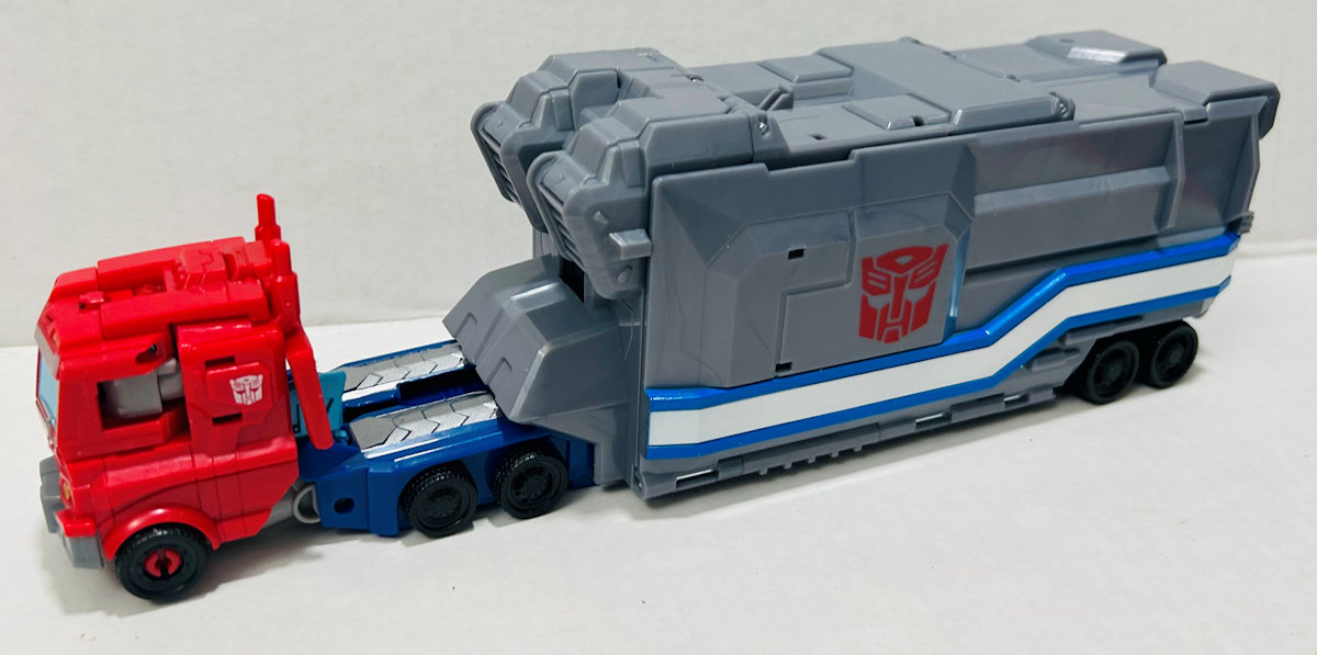 I went back and read my review of Cyberverse Warrior Class Optimus Prime. I was so much kinder to it than it deserved. He’s been repainted, every paint app was changed. It does not improve the crappy mold. The trailer remains pretty cool and is also repainted, but nothing has been improved.
