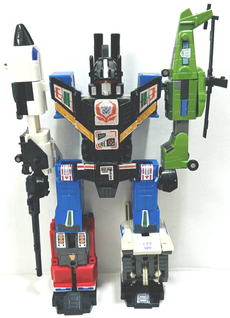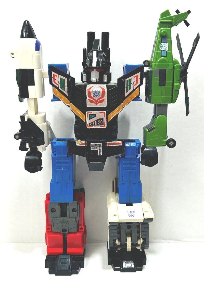 Battle Gaia is one of the most sought Transformers ever made. Released in Japan in 1992, he is the first of many repaints of Bruticus. Min was missing many of his stickers, but as luck would have it, I found reproduction stickers and Zabgoth expertly applied them for me. However, I took the pics of the individual vehicle and robot modes before he applied the stickers.
