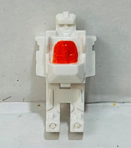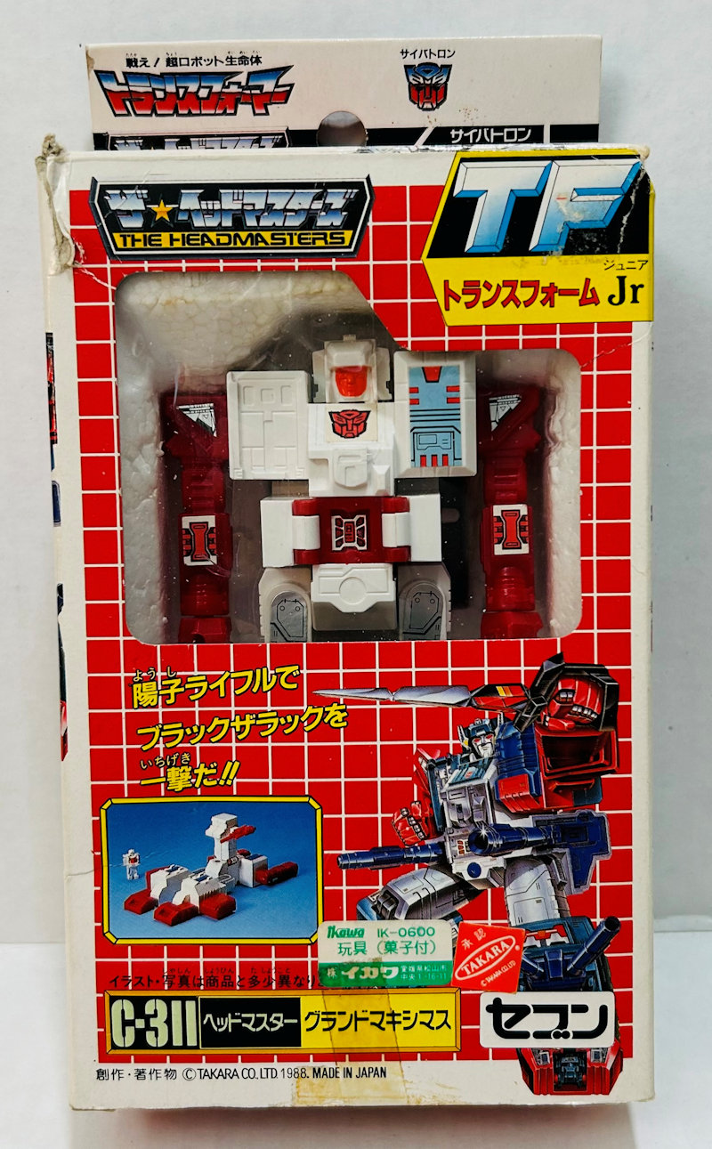 Grand Maximus’s headmaster is pretty bad. It’s his head turned upside down with a separate part for his legs, but the rest of him is pretty cool. He only has one alternate mode, his battle station mode, and only one weapon. Old white toys tend to yellow over time, and I’m amazed that he doesn’t have a spot of yellow on him. I think his only paint app is the orange paint on his face. Is he the best toy, no, but I’ve been after him for 27 years trying to complete my set of Transformers Juniors.