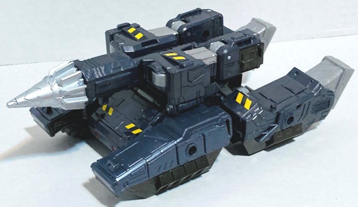 Hey, Hasbro, it just might be time for a new Megatron mold. He’s now a miner and has been converted to a drill tank in predominantly black and gray. He looks fine. I really like this mold, but the best version of it is the Earthrise version, and they’ve only used it twice. It seems to be about time to retire it.