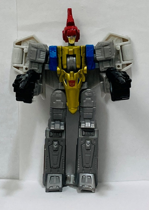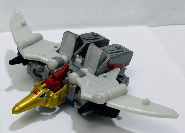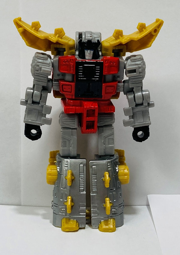 Swoop looks pretty great in pteranodon mode. I just wish his feet didn’t stick up so much on his back. He looks good in robot mode, but I wish he had G1 weapons rather than Volcanicus’s fists.