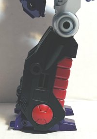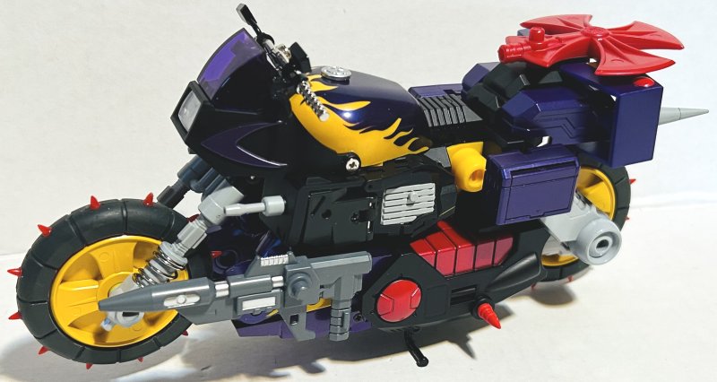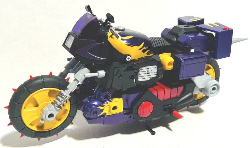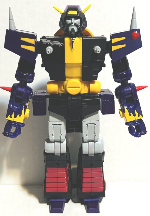 Shattered Glass Wreck-Gar includes a miniature television, a bunch of energon cubes, and some beads for his beard. He looks awesome in motorcycle mode. As much as I am ready for Shattered Glass to be retired, these colors look amazing on this toy. It’s just beautiful. In robot mode his head sculpt is perfect. I love the beard and mustache. I only have one complaint about his robot mode and that is his legs. I hate it when a toy’s lower legs don’t stand straight. He’s designed like he is standing with a knee bend, his knees out over his feet.