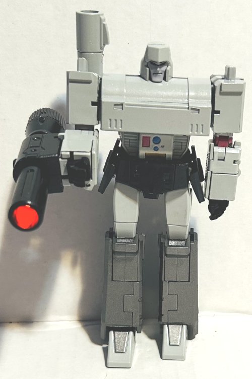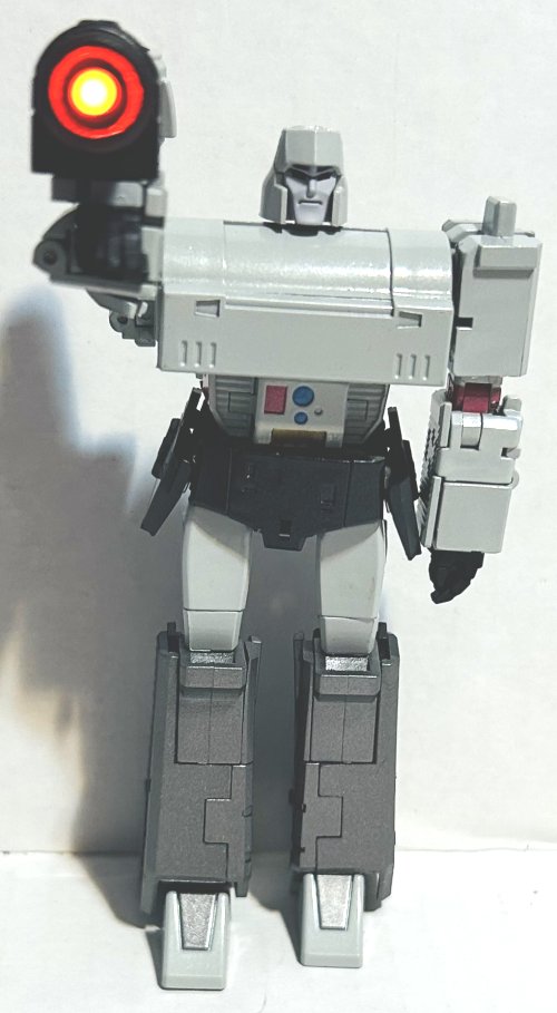 Magic Square Megatron is an awesome toy. He looks great in all modes, though I never could quite get his gun mode perfect. What really makes this toy great is the LED in his fusion cannon. If not for that I would say he is significantly overpriced. Instead he is just moderately overpriced. He does not have any built in electronics. The light is an LED and battery, which I believe are the kind used for fishing lures. It looks amazing lit up. The pictures show the light being red, but I am fairly sure it’s actually green, and looks red due to some odd camera effect.