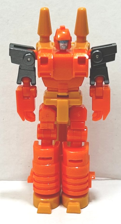 This is a great looking Targetmaster. He’s got a painted face and eyes. In gun mode he in addition to his main gun barrel there are two smaller barrels. He just looks really cool.