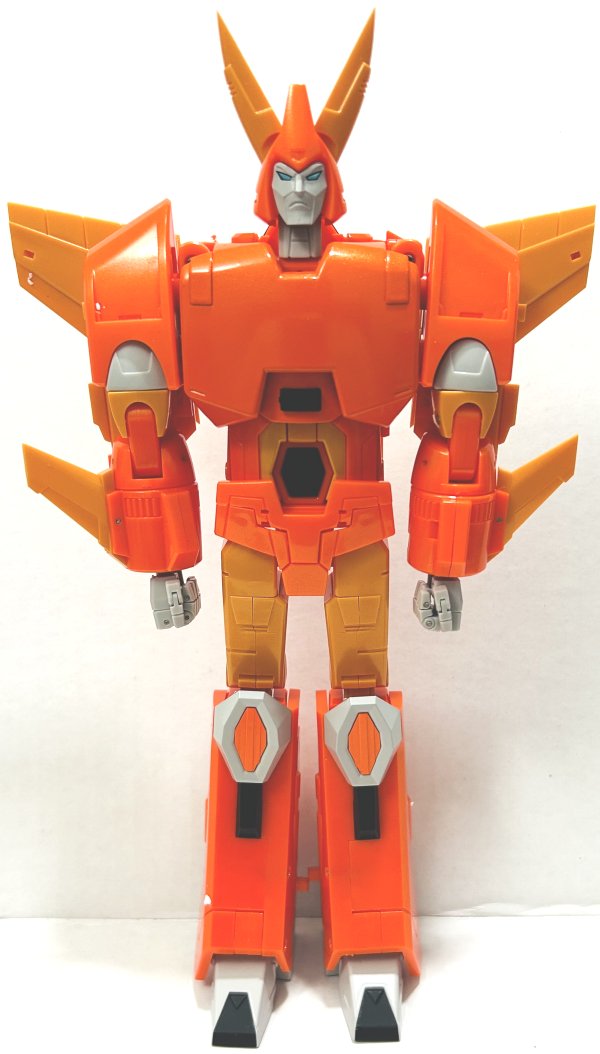 Robot Mode: Cyclonus looks awesome in robot mode. I love his face sculpt and colors. I’m not a big fan of Shattered Glass, but orange is my favorite color, so I love this paintjob. All of his various guns look great. I don’t know what to make of the samurai armor, but I love his swords.