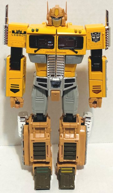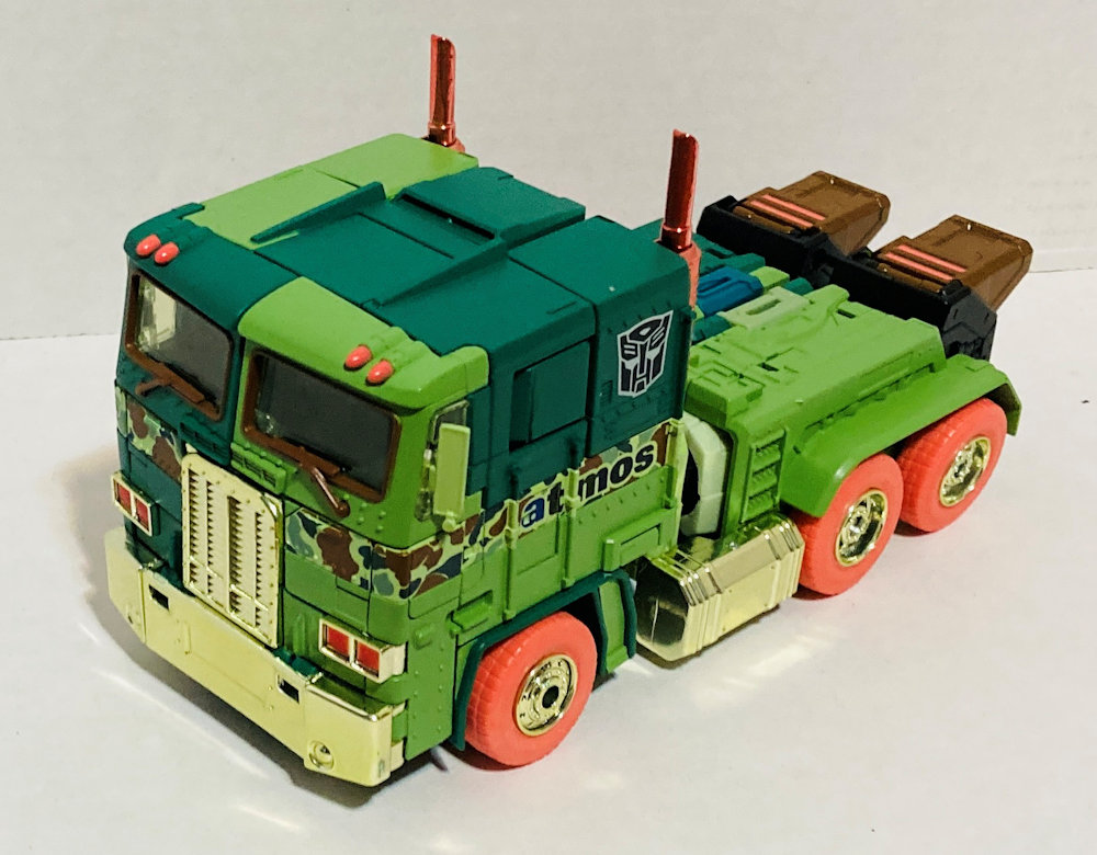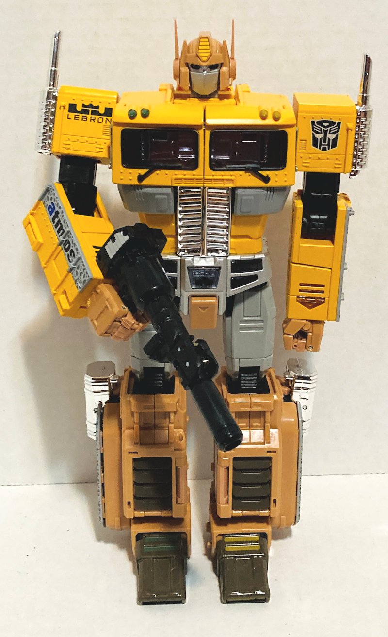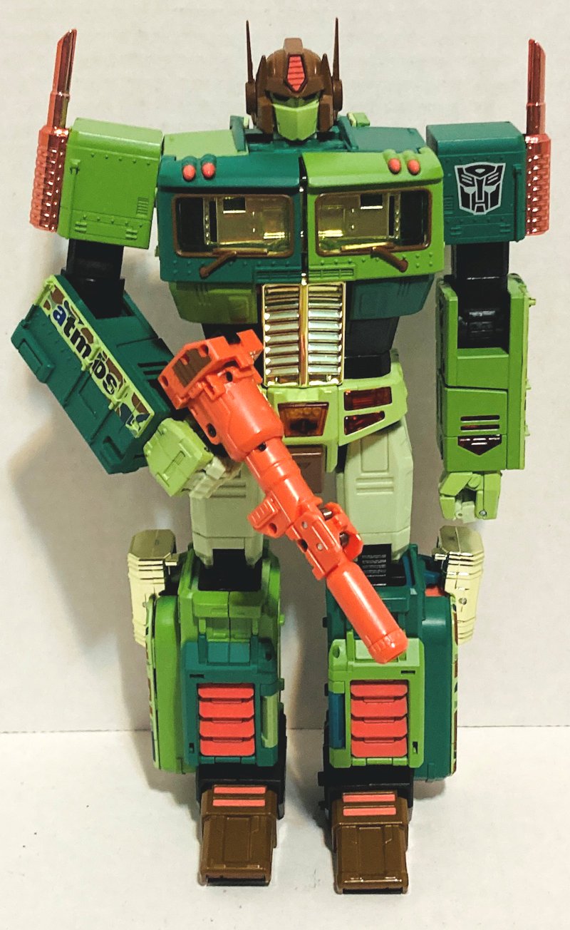 Exclusive to Japanese Atmos stores, MP-ASL Safari Convoy matches colors of Lebron James’ sneakers for some idiotic reason. I don’t hate the yellow and tan color scheme. I rather like the spotted band around the cab. I just don’t like Lebron James. MP-10DC Duckcamo Optimus Prime (I have no idea why Duckcamo is one word) looks awesome. It’s completely insane, but I like it. He two is colored to match sneakers, which I assume are meant to be camouflaged like a duck blind. That’s the only thing I can make sense of. The different shades of green with brown and orange highlights look great. I love the orange gun.