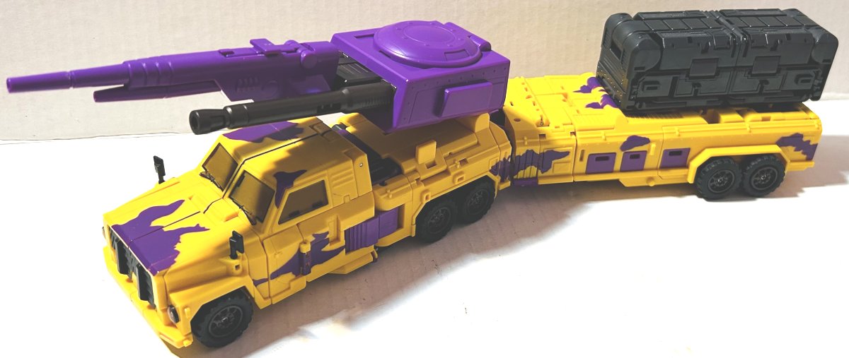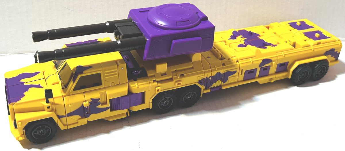 Vehicle Mode: Onslaught has two vehicle modes, both of which are amazing. He has the standard long flatbed with the gun mounted on it and can also be configured to be a truck with a trailer. His paintjob is perfect.