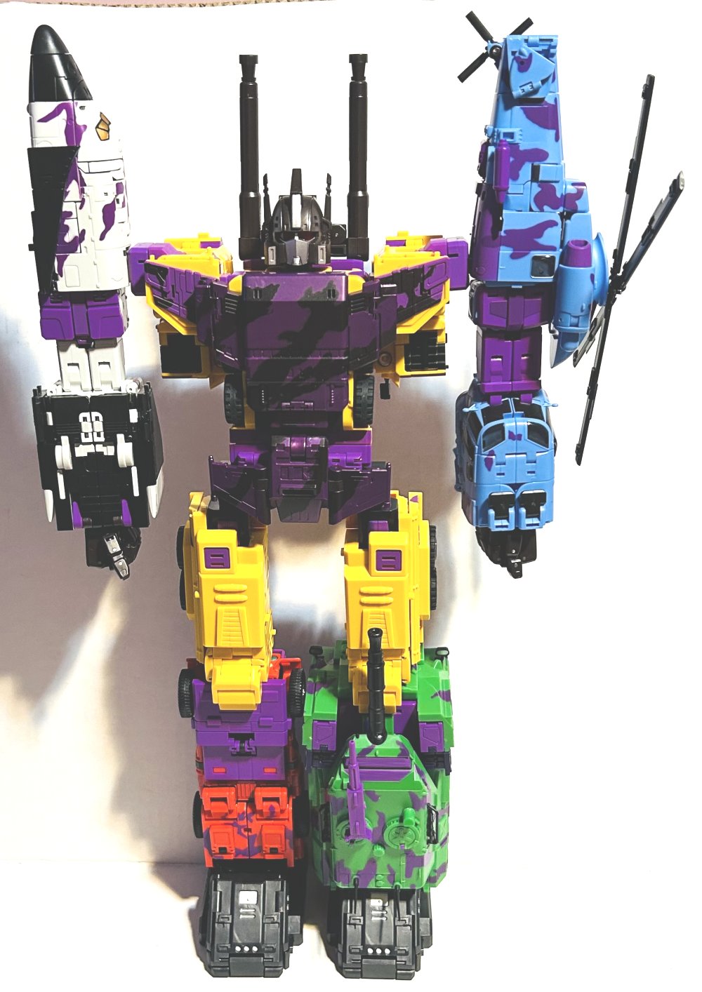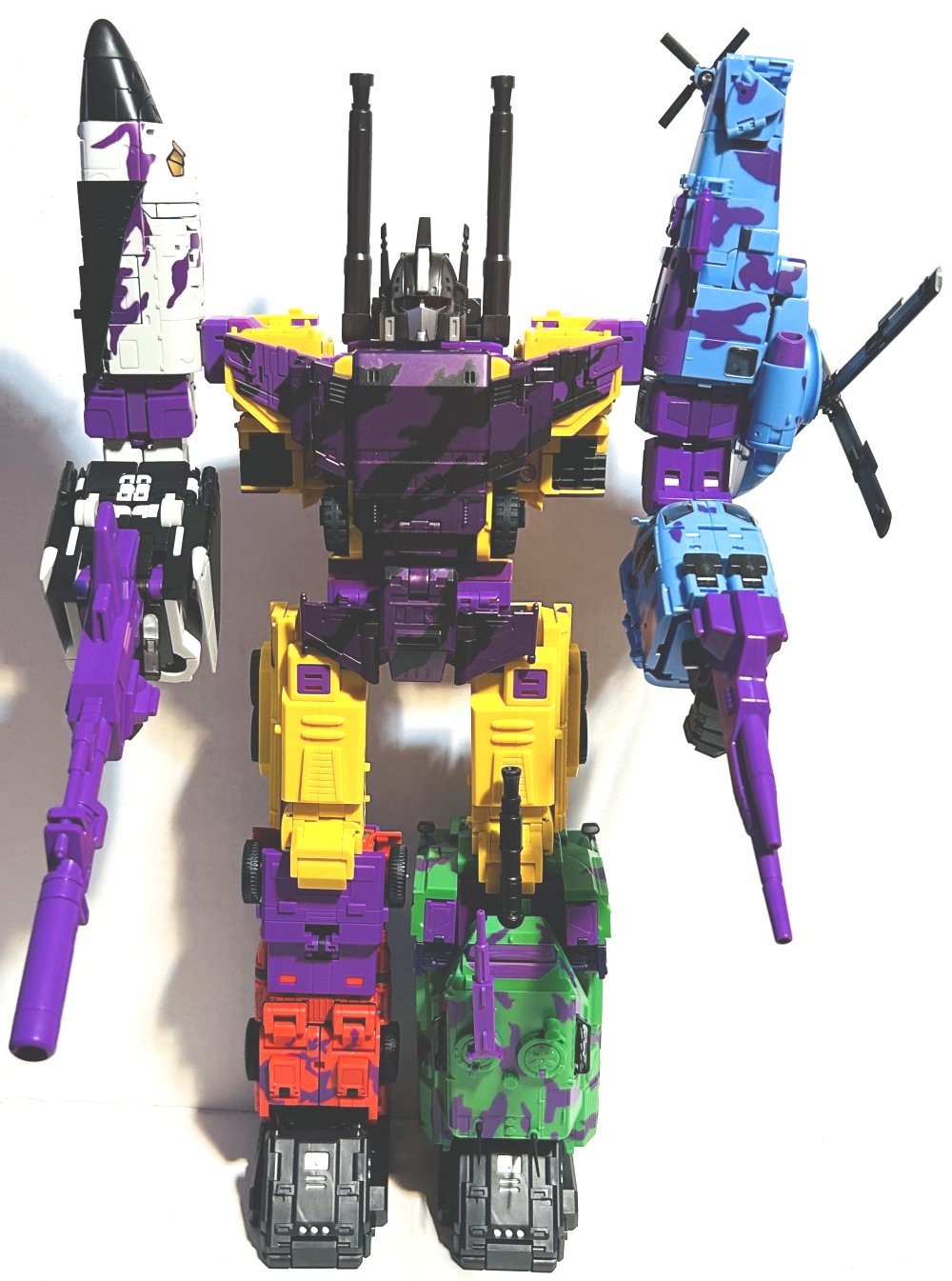 Bruticus is awesome! He is absolutely perfect. You’ll note there are two pics above with his weapons and in the second one he is a little shorter. The first two pics are how he is shown transformed by the instructions. Unfortunately, he seems a bit unstable that way. If you reconfigure his legs to make him a bit shorter he’s a rock. I don’t think it affects his proportions that much. I think he looks great either way. I think scarifying a little height for stability makes sense.