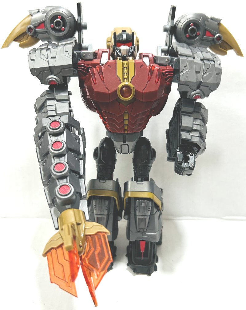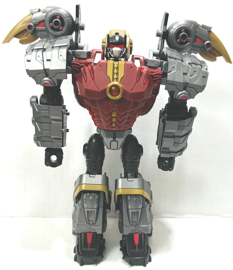 Robot Mode: Triton is just perfect in robot mode. I love his head sculpt, and his colors are perfect. He’d fit right in with the other Dinobots. In addition to his giant guns his tail becomes a weapon and he has two swords (they are kind of short for swords, so maybe knives would be more accurate).