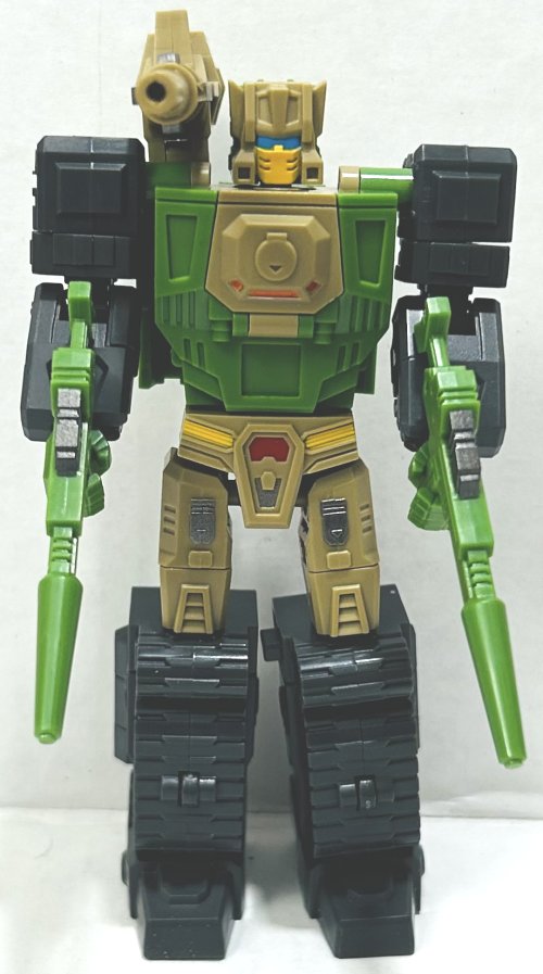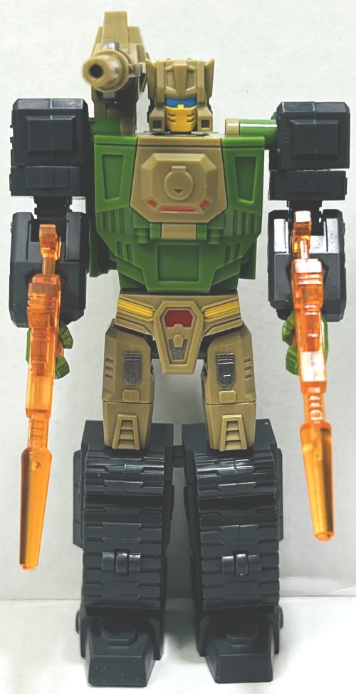Hardhead is generally faithful to the G1 toy, except for the bottoms of his feet behind his cockpit. His colors are perfect and he has plenty of paint apps. He comes with two sets of guns, one of which is cast in translucent orange plastic.
