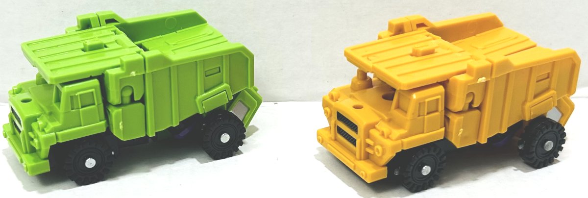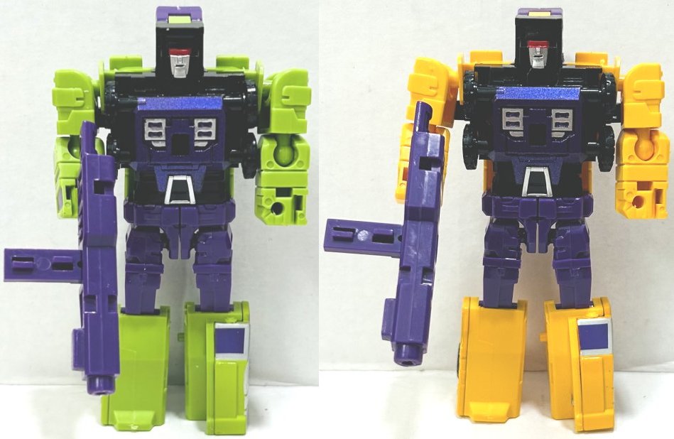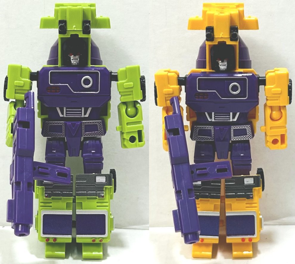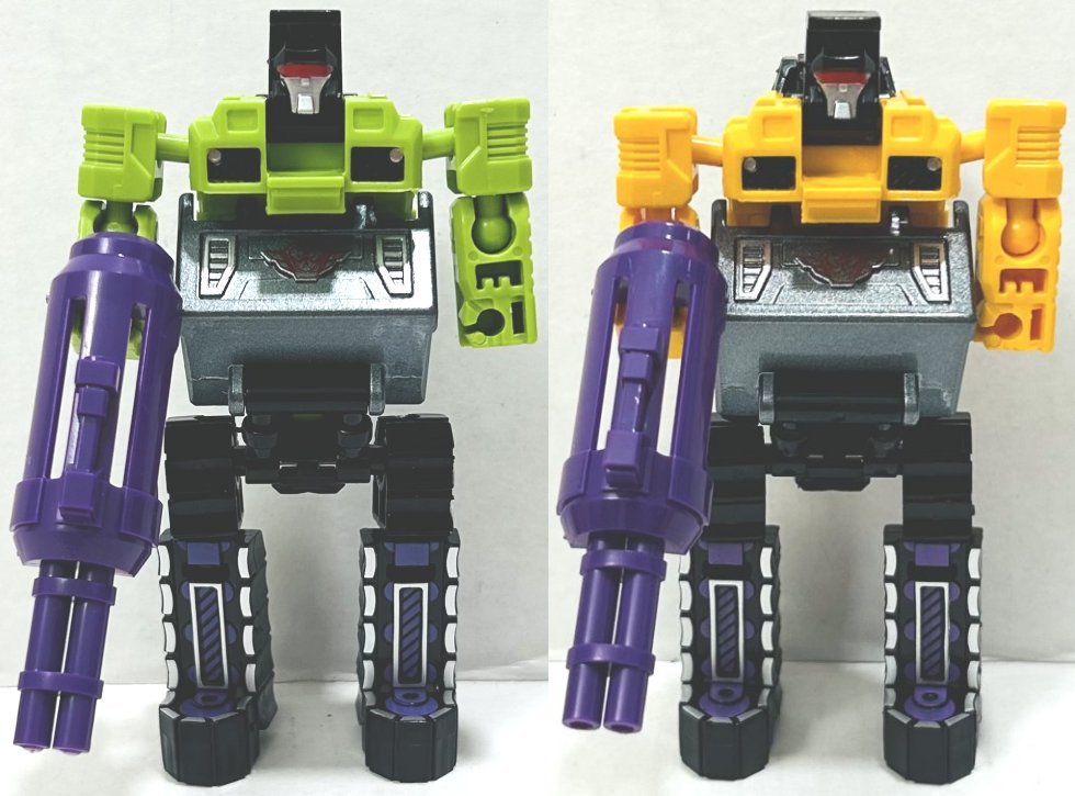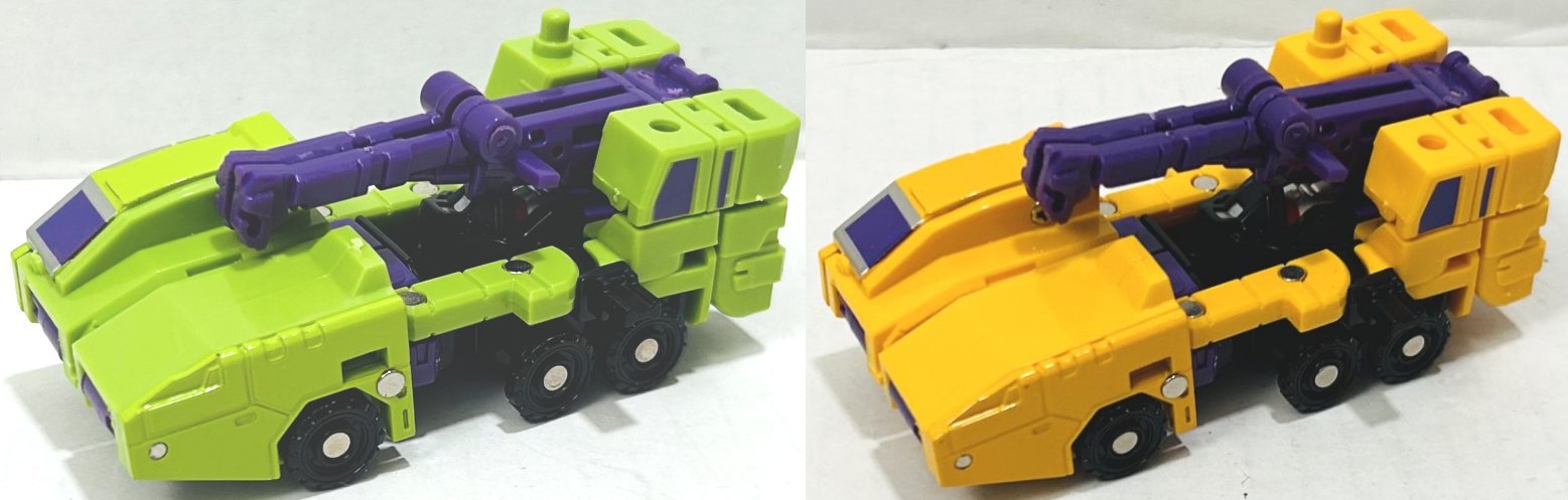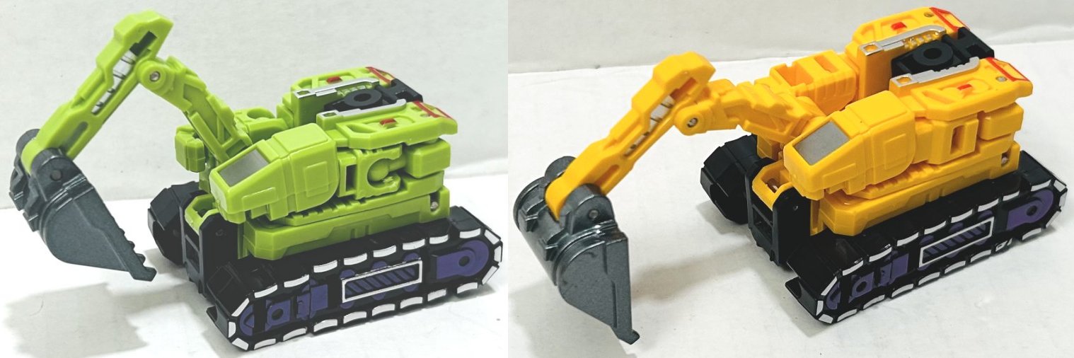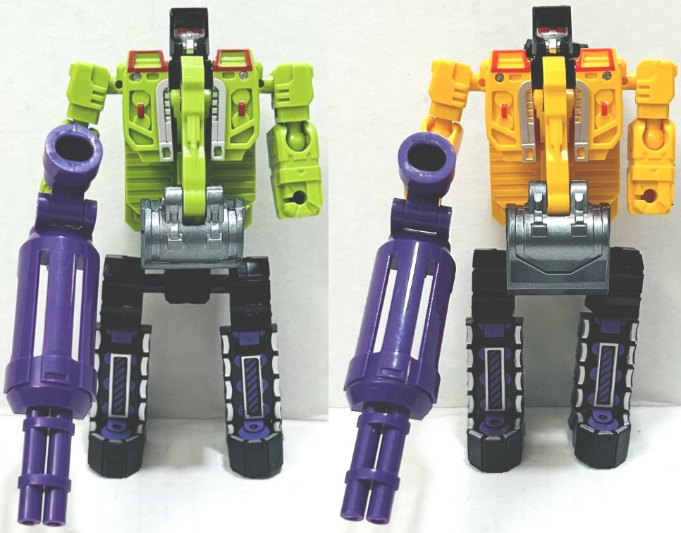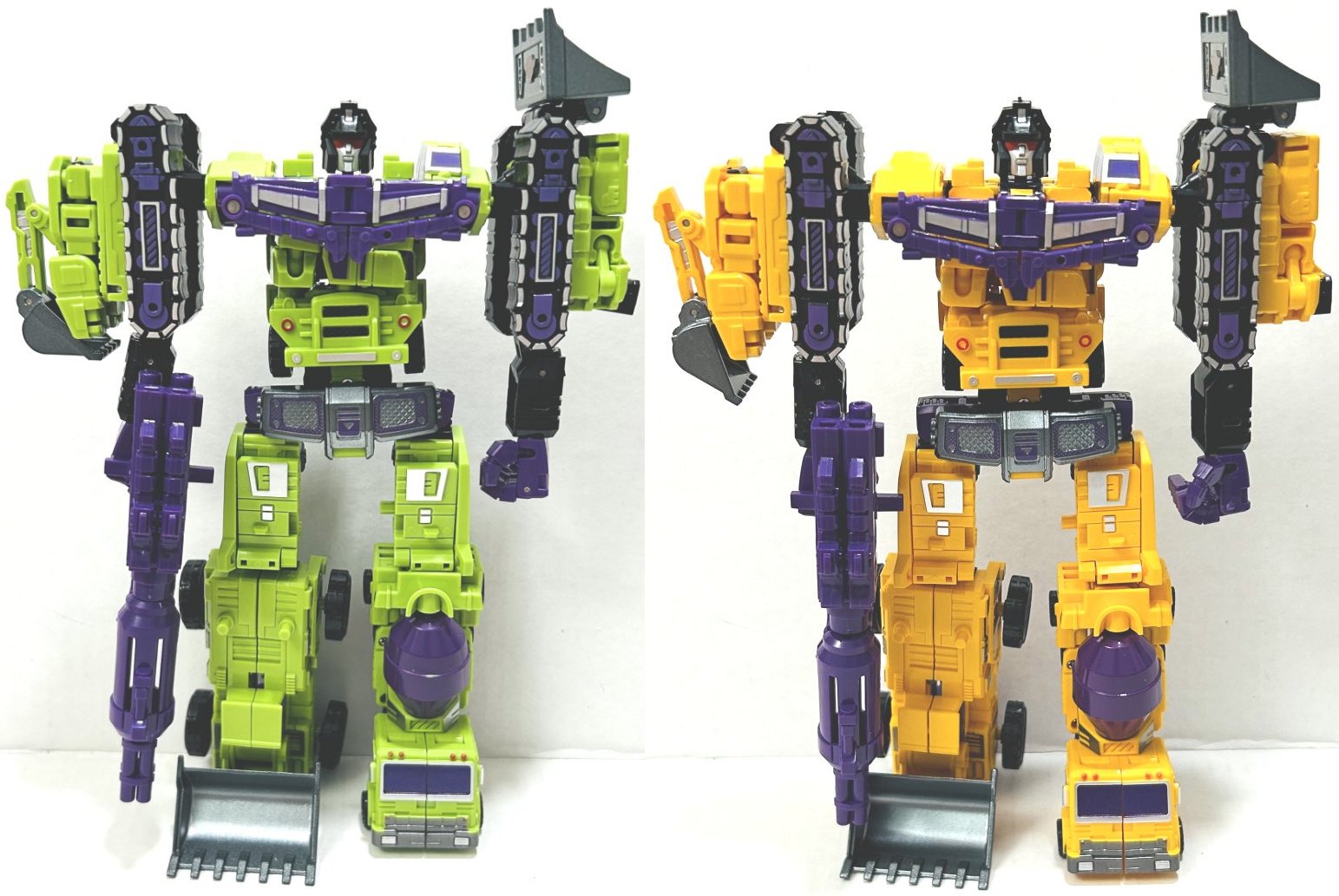 I picked these third party, or knockoff if you prefer, Devastators up on Ali Express. (I think they might actually be knockoffs of third party toys, but I don’t know, someone really needs to start a Third Party Transformers Wiki.) I have a green and yellow version of both sizes (four total). They are pretty cheap. The larger one (which is about 10 or 11 inches tall when combined I believe) is around $20, and the smaller one (about 8 inches) is around $10, but prices vary. The name on the box the bigger one comes in says “Xingbianchanshen”. I have no idea how I would even try to pronounce that. The smaller version is not a downsized mold, it’s clearly based on the design of the larger one, but the design is simplified and the detail reduced. One of the coolest thing about this set is how it incorporates all of Devastator’s parts into the toys. Let’s start with the larger version first.