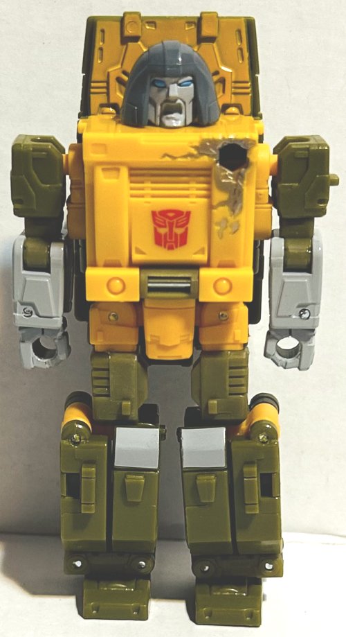 Hasbro has finally figured out how to properly do battle damaged right. Brawn has had his chest remolded to simulate the fatal shoulder wound he received during the attack on the Autobot shuttle in Transformers the Movie. He has a new screaming head sculpt.