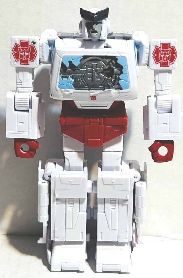 Ratchet, like Ironhide, has the same remolding as Ironhide in addition to the new screaming face to simulate the damage he took when he was killed on the Autobot shuttle in Transformers the Movie. Very well done.