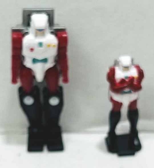 Ginrai looks great, now with lighter red arms and thighs. Also included is a small non-transforming Ginrai.