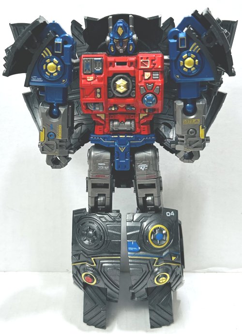 Robot Mode: Primus looks awesome in robot mode. I love the paint apps, there are a lot of them, and so much molded detail. He has a really great face sculpt that is very well painted. His giant scythe is awesome. He is about the size of a leader class toy, close to eight inches.