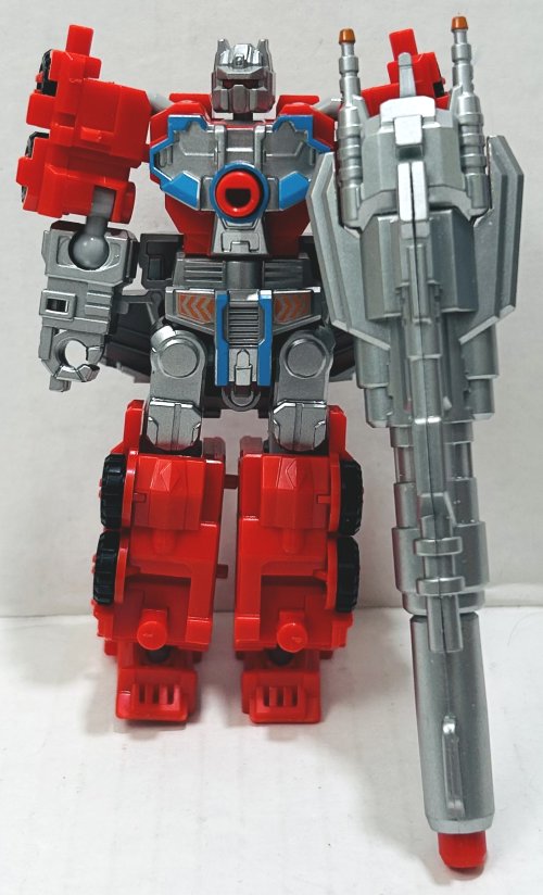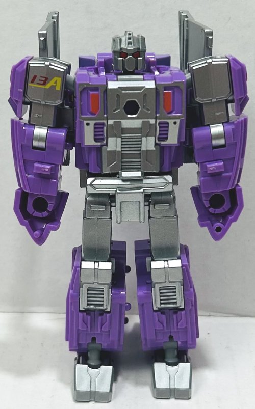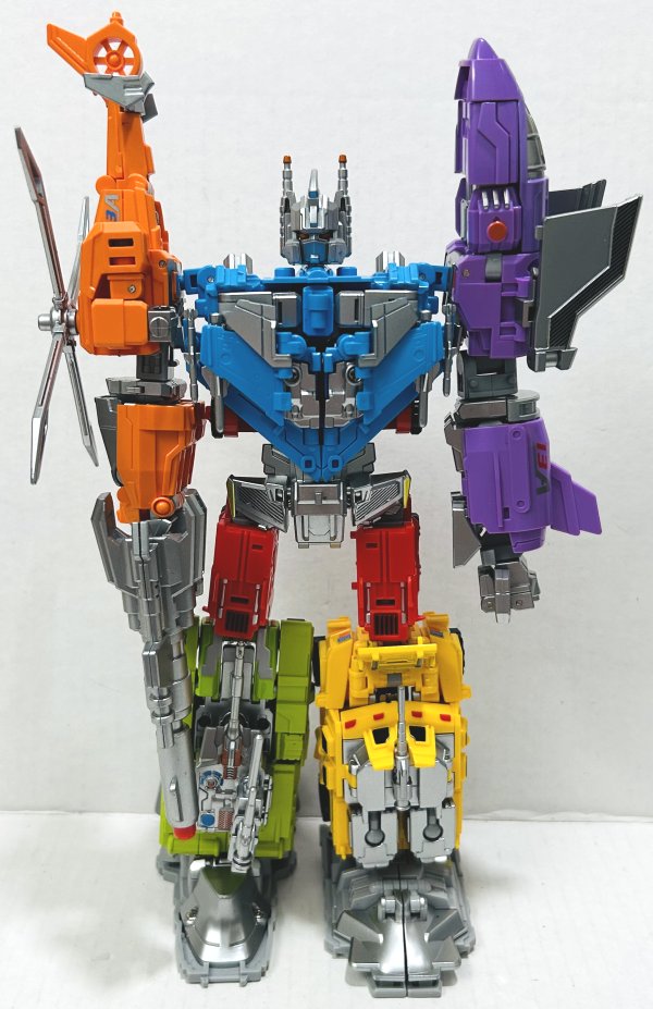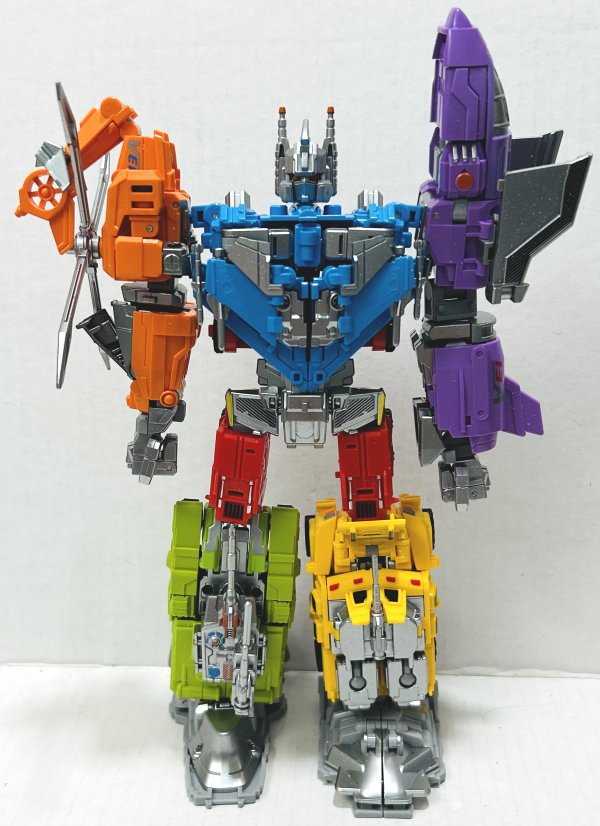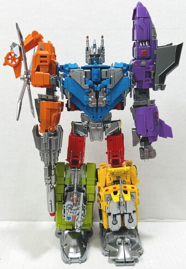 Bruticus is a knockoff of Iron Factory War Giant, with a lot of changes, most notably adding an additional bot to become his feet and reducing “Onslaught” to the size of his teammates and adding a jet to become Bruticus’s head and shoulders. I don’t have the Iron Factory version, so I can’t specifically tell you how different it is, but from pics I’ve seen, it seems significant. Can’t remember exactly what I paid for it, but it was pretty cheap. His color scheme would fit right in with G2, while not using Bruticus’s actual G2 color scheme. I have made up names for the additional bots as it amused me to do so.